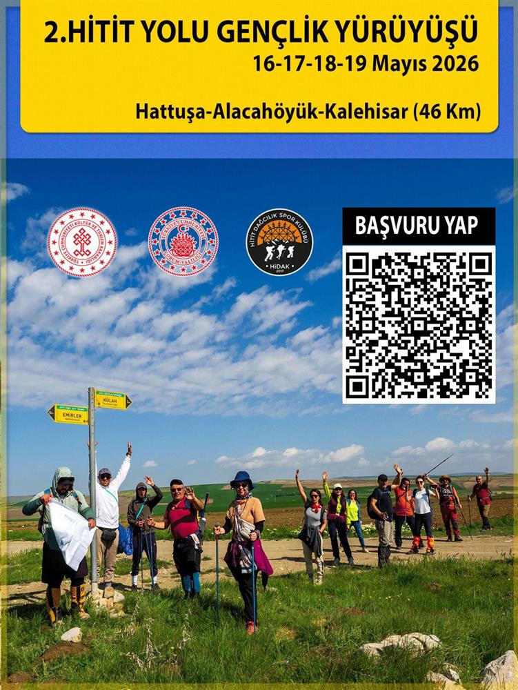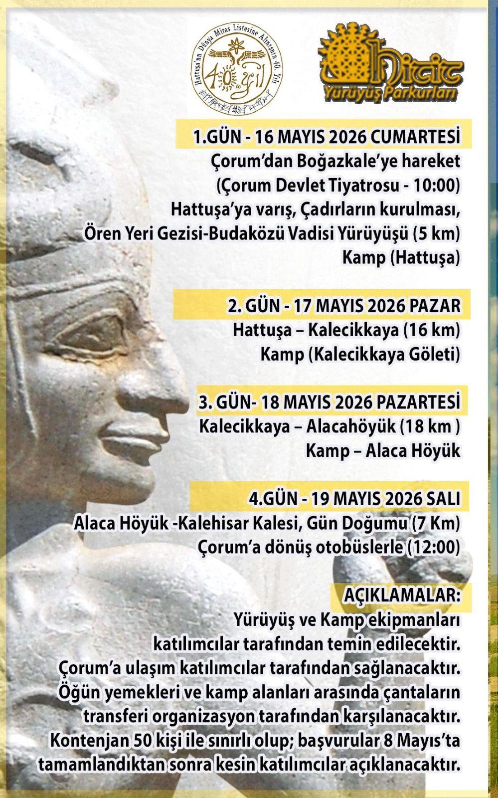 2. Hitit Yolu Gençlik Yürüyüşü etkinliği kapsamında, müze ve ören yeri gezileri de yer alacak. 16 Mayıs 2026 günü Hattuşa’dan başlayacak faaliyete katılacak doğa severler için Çorum’dan Hattuşa’ya ulaşım sağlanacaktır.